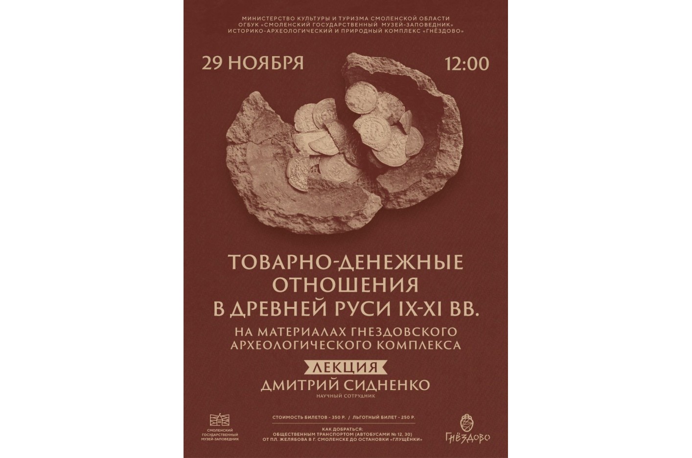 29 ноября в 12.00 состоится лекция научного сотрудника Дмитрия Сидненко «Товарно-денежные отношения в Древней Руси IX-XI вв. на материалах Гнездовского археологического комплекса». Посетители смогут узнать информацию о 15 кладах, обнаруженных в ходе археологических раскопок в Гнездове. Все они носят денежно-вещевой характер.
