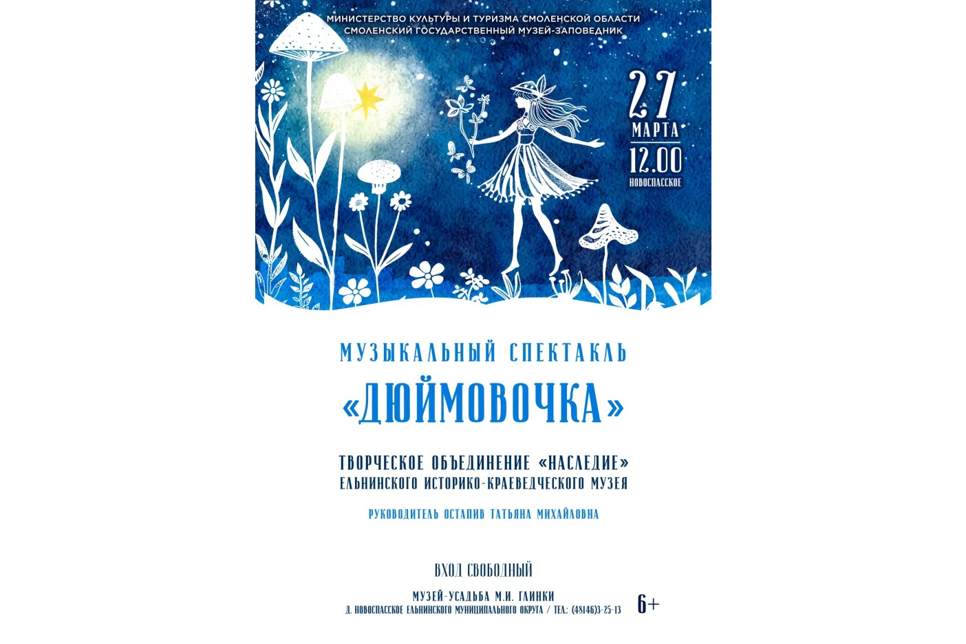 - 27 марта в 12.00 в Музее-усадьбе М.И. Глинки состоится музыкальный спектакль «Дюймовочка» по мотивам одноимённой сказки Ганса Христиана Андерсена