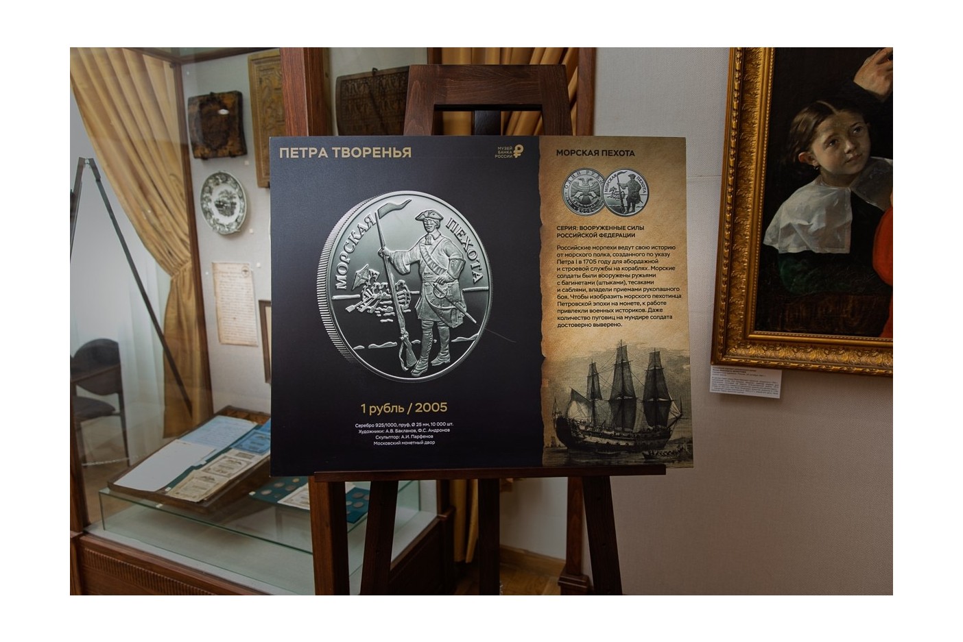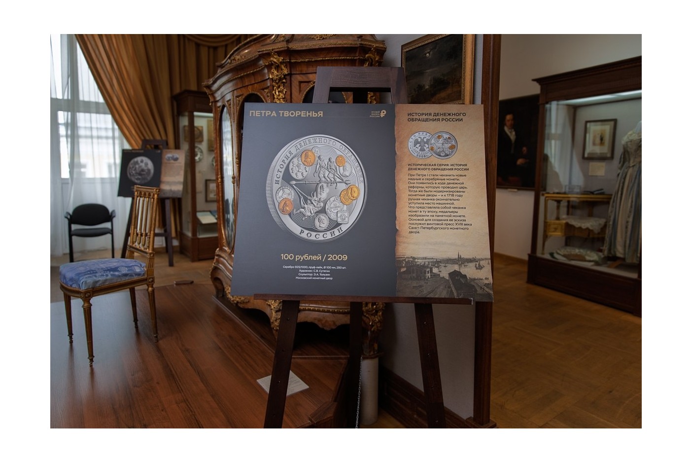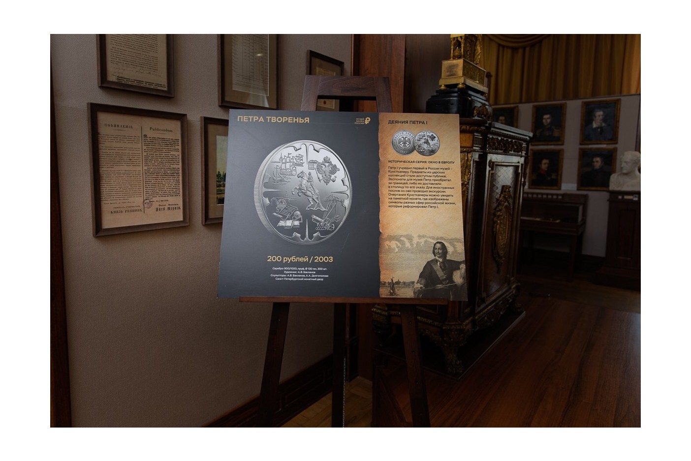 Гости музея смогут увидеть изображения уникальных памятных серебряных и золотых монет разных номиналов, посвященным важнейшим событиям в истории России эпохи Петра Великого (1689-1725). Среди них - начало строительства Санкт-Петербурга, развитие русской морской торговли на Балтийском море, учреждение морской пехоты, открытие первого отечественного музея – Кунсткамеры, утверждение высшего воинского звания «генералиссимус», чеканка полновесного серебряного «рубля» и ряда новых серебряных и медных монетных номиналов.