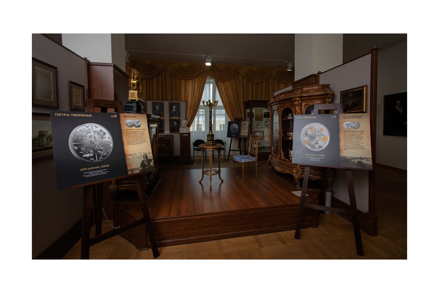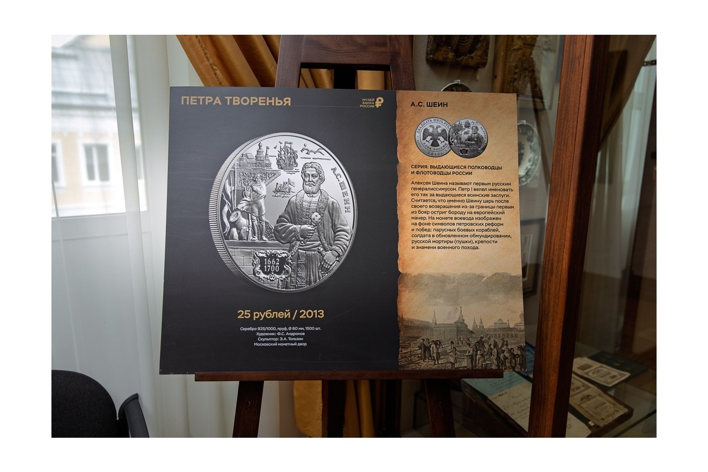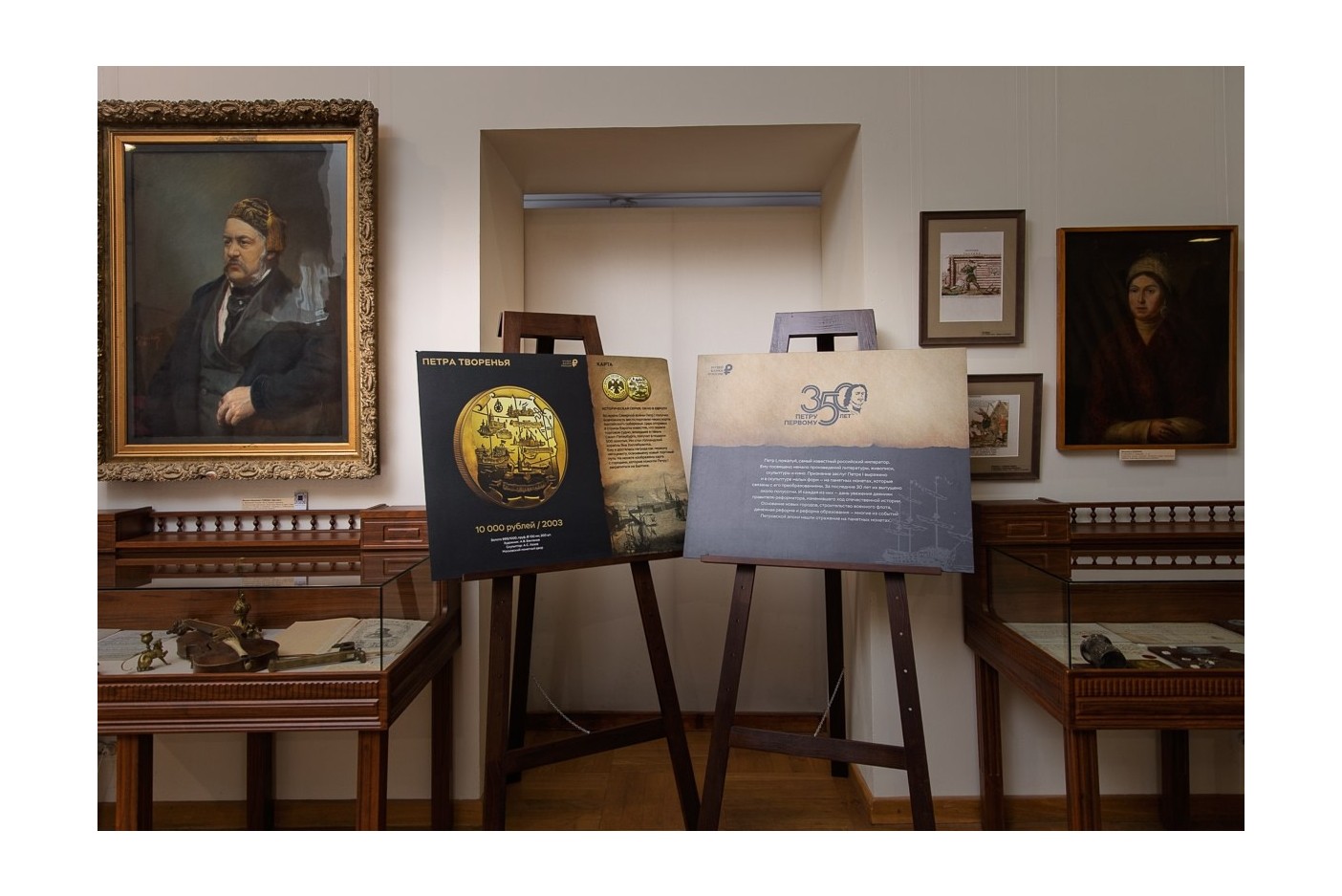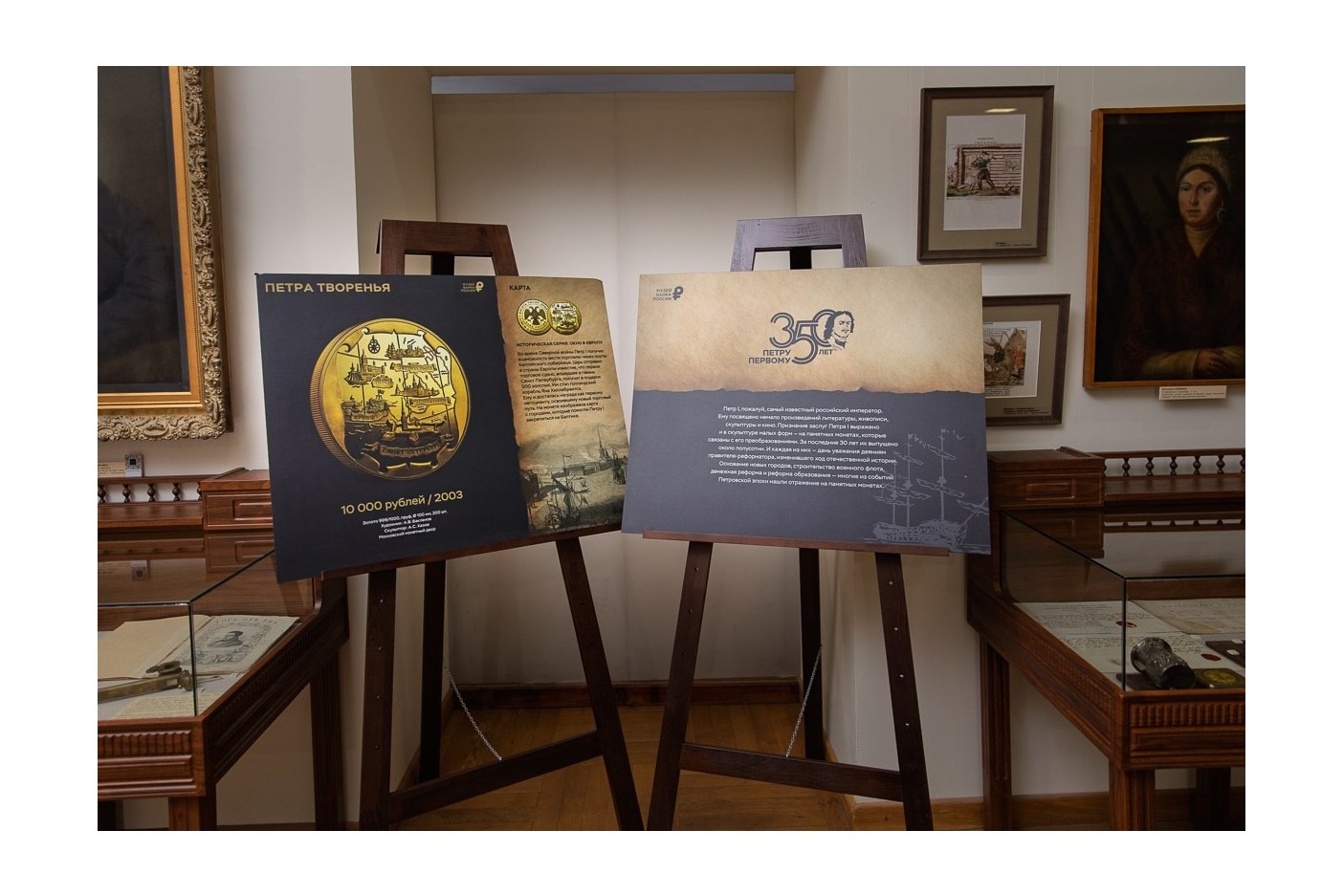 Гости музея смогут увидеть изображения уникальных памятных серебряных и золотых монет разных номиналов, посвященным важнейшим событиям в истории России эпохи Петра Великого (1689-1725). Среди них - начало строительства Санкт-Петербурга, развитие русской морской торговли на Балтийском море, учреждение морской пехоты, открытие первого отечественного музея – Кунсткамеры, утверждение высшего воинского звания «генералиссимус», чеканка полновесного серебряного «рубля» и ряда новых серебряных и медных монетных номиналов.