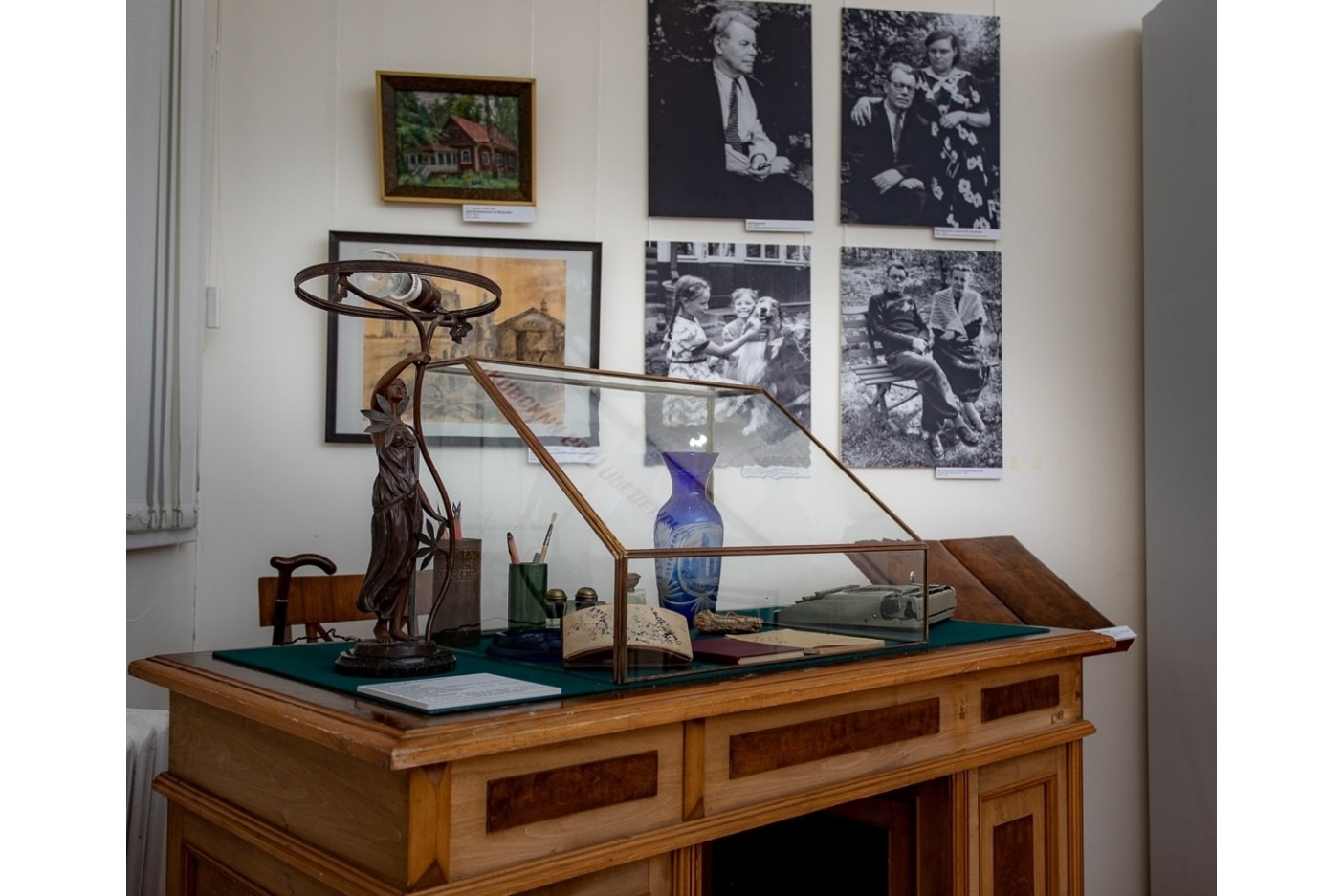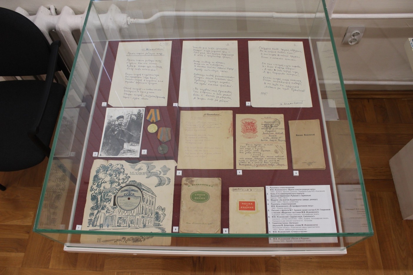 Среди более чем двухсот экспонатов можно увидеть мемориальные предметы, принадлежавшие Михаилу Васильевичу: рабочий стол, портативную пишущую машинку, настольную лампу, чернильный прибор и письменные принадлежности. Особый интерес вызывают личные вещи поэта – очки и трость.