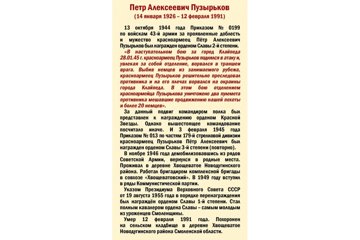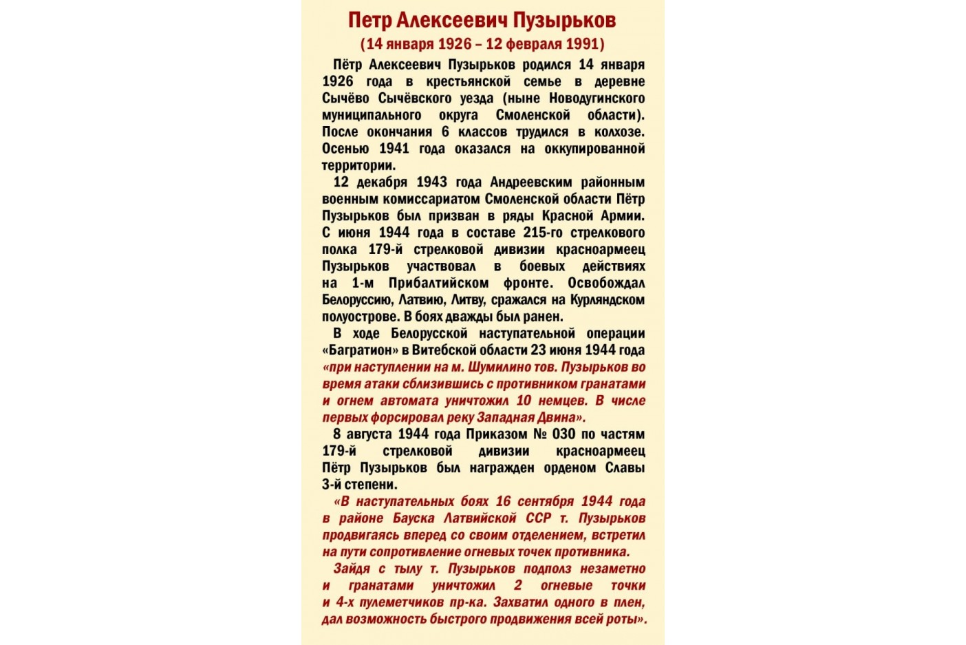 «В наступательных боях 16 сентября 1944 года в районе Бауска Латвийской ССР т. Пузырьков продвигаясь вперед со своим отделением, встретил на пути сопротивление огневых точек противника.