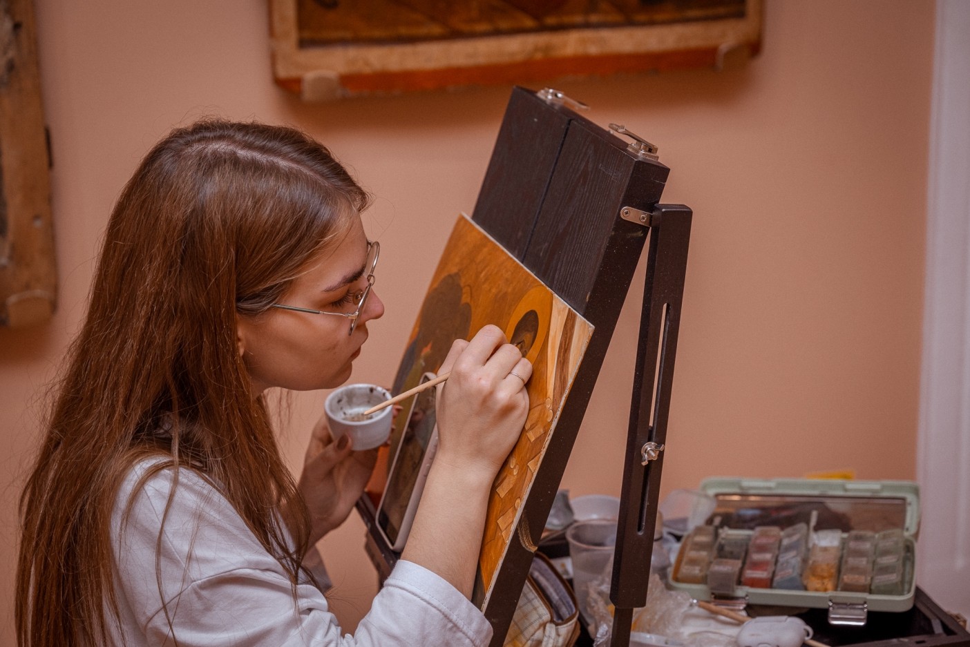 В технике темперной живописи они копируют иконы "Вход в Иерусалим" XVI века и "Архистратиг Михаил" XVII века и приобретают бесценные навыки, обучаясь на лучших примерах.