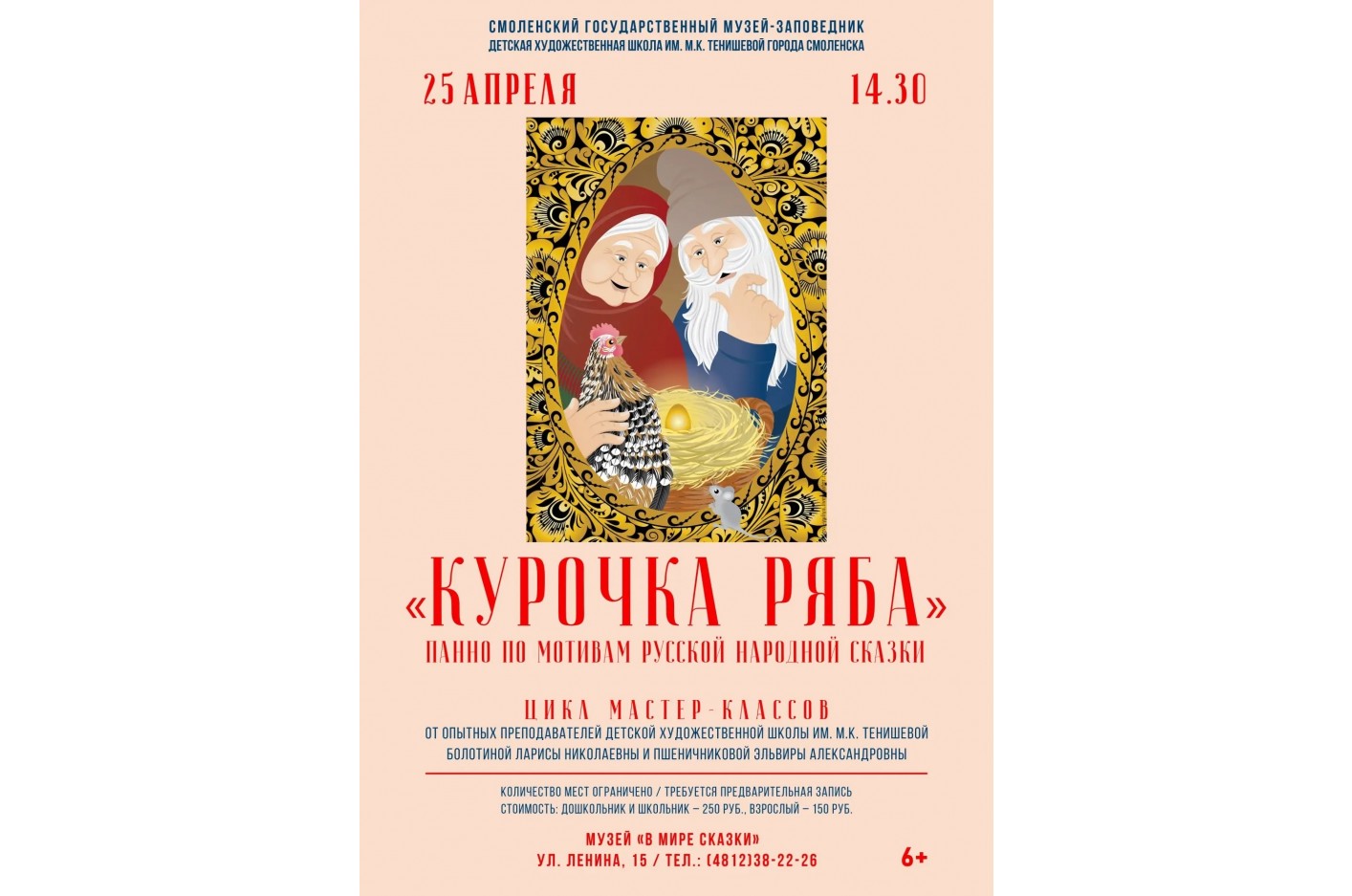25 апреля в 14:30 талантливые преподаватели Детской художественной школы им. М. К. Тенишевой Лариса Болотина и Эльвира Пшеничникова помогут ребятам создать красочное панно по мотивам русской народной сказки «Курочка Ряба».