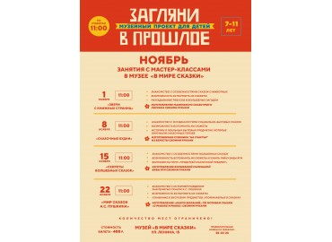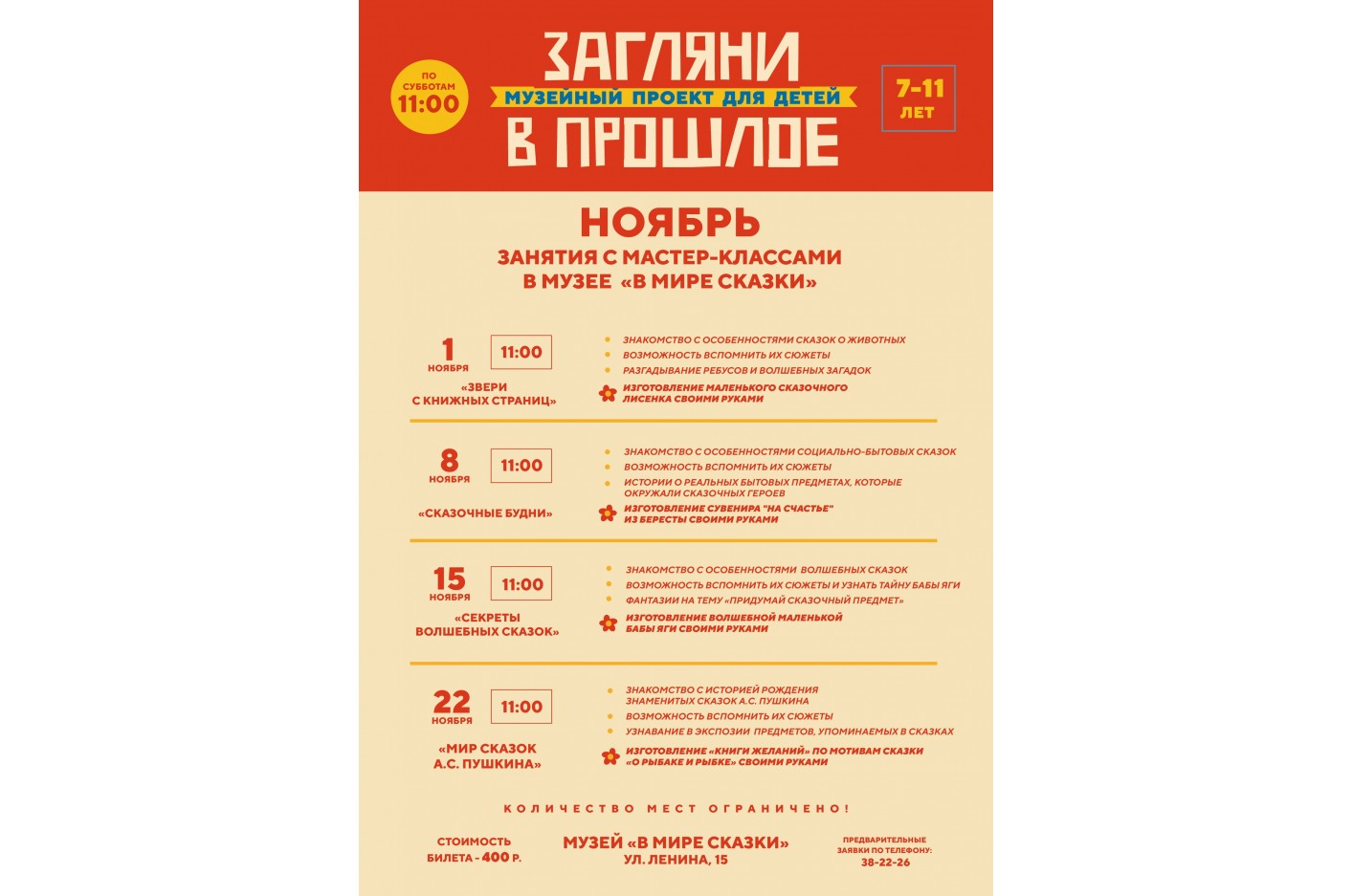 В ноябре занятия пройдут в музее «В мире сказки». Дети смогут вспомнить сюжеты любимых сказок и определить их характерные особенности, а также разгадать занимательные ребусы и загадки.