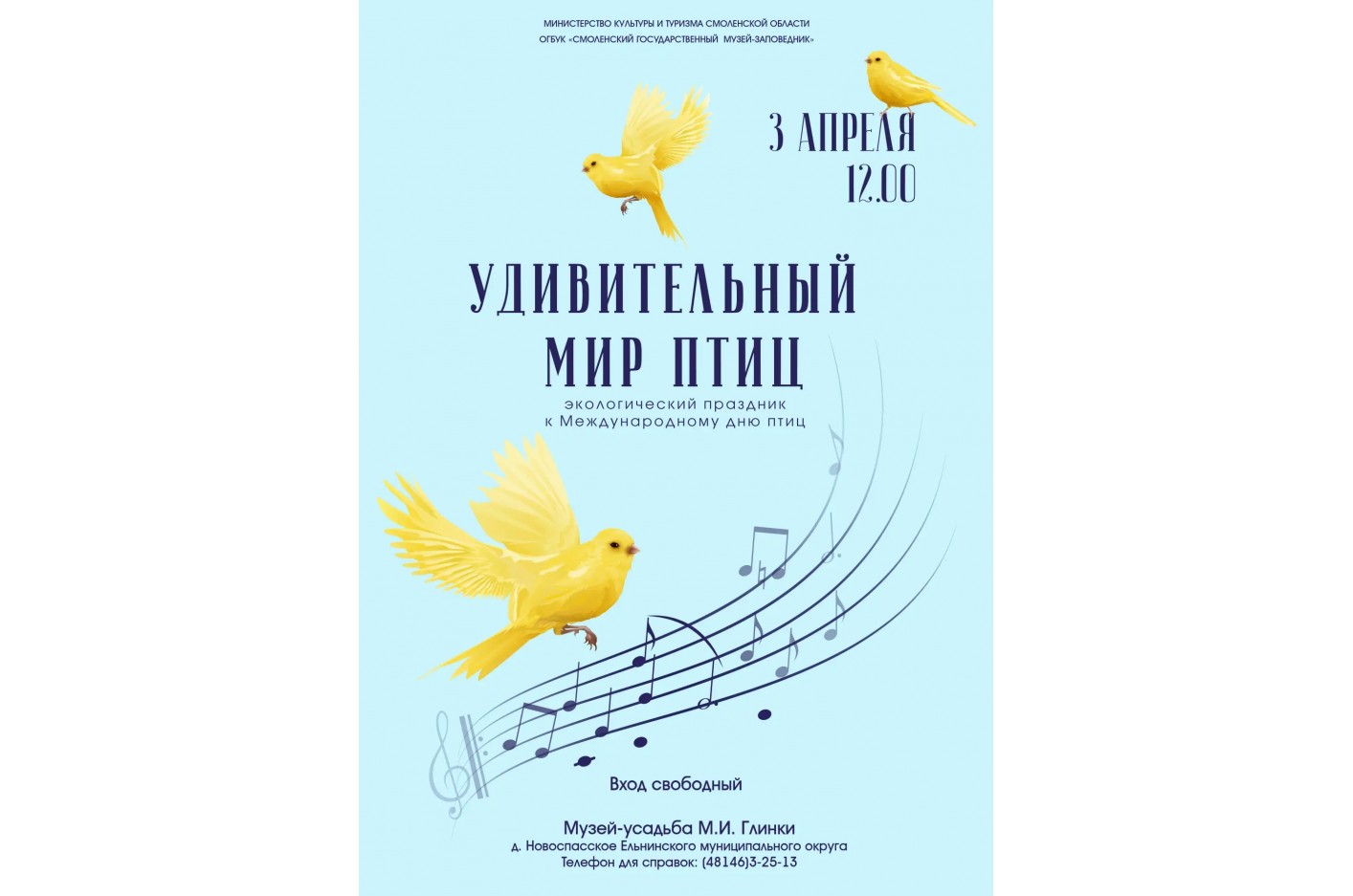 3 апреля в 12.00 в музее-усадьбе М.И. Глинки пройдет экологический праздник, приуроченный к Международному дню птиц.
