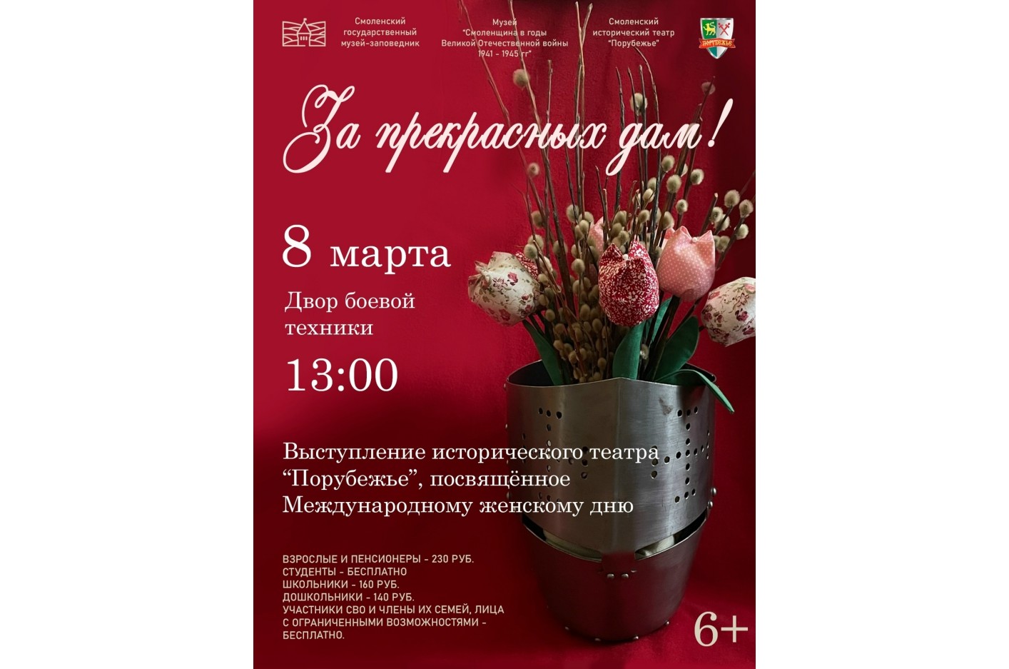 Дорогие друзья! 8 марта в 13:00 во дворе музея «Смоленщина в годы Великой Отечественной войны» состоится выступление исторического театра «Порубежье».