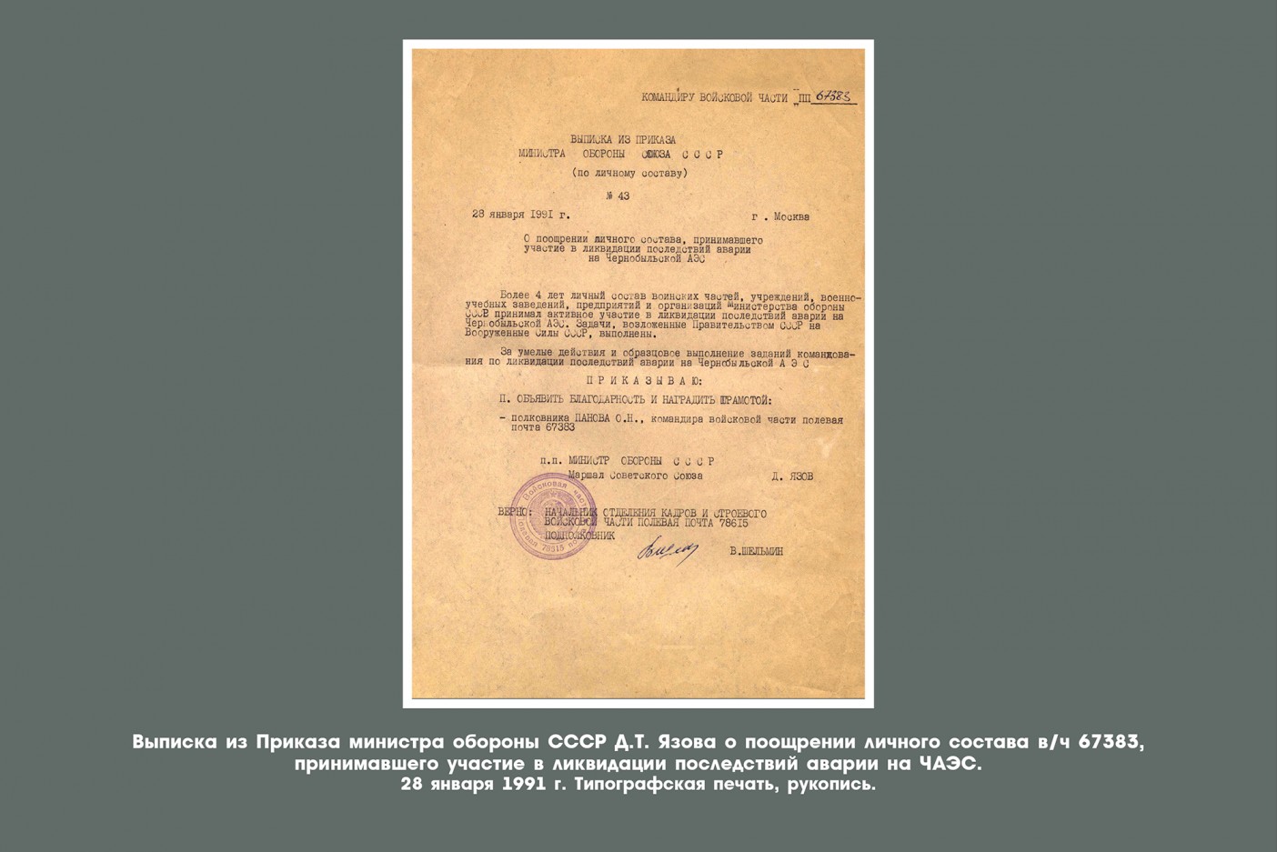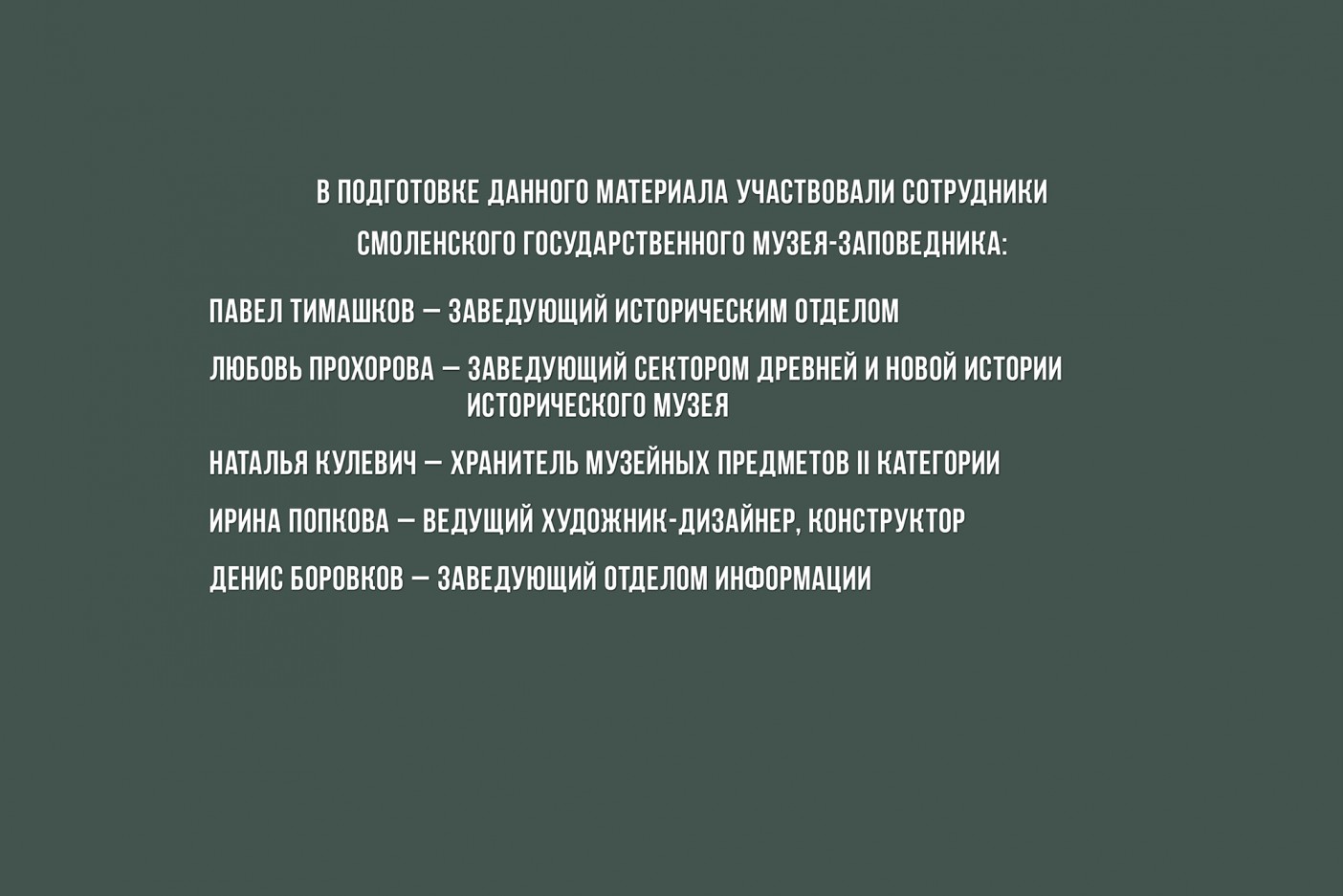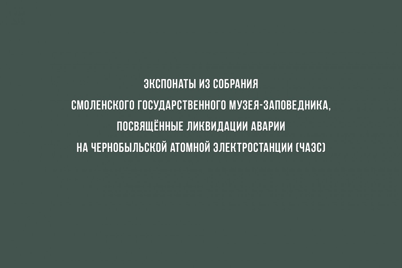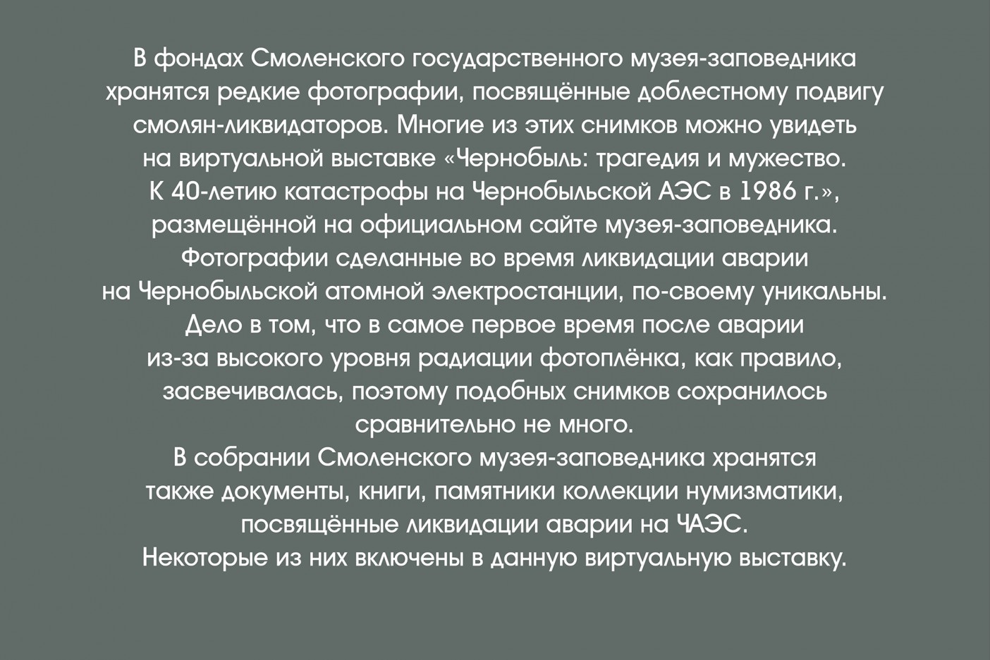 В собрании Смоленского музея-заповедника хранятся фотографии, документы, книги, памятники коллекции нумизматики, посвящённые ликвидации аварии на ЧАЭС. Многие и этих экспонатов можно увидеть на данной виртуальной выставке - «Чернобыль: трагедия и мужество».