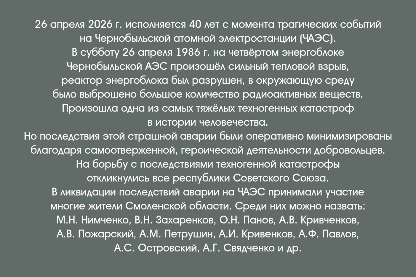 26 апреля 2026 г. исполняется 40 лет с момента трагических событий на Чернобыльской атомной электростанции (ЧАЭС).