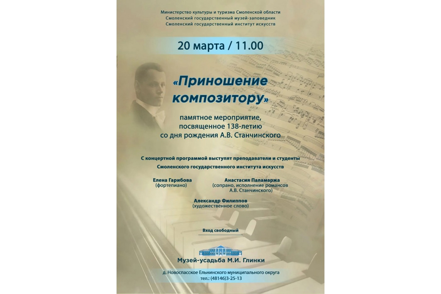 - 20 марта в Музее-усадьбе М.И. Глинки состоится памятное мероприятие, посвященное 138-летию со дня рождения известного композитора и пианиста Алексея Станчинского