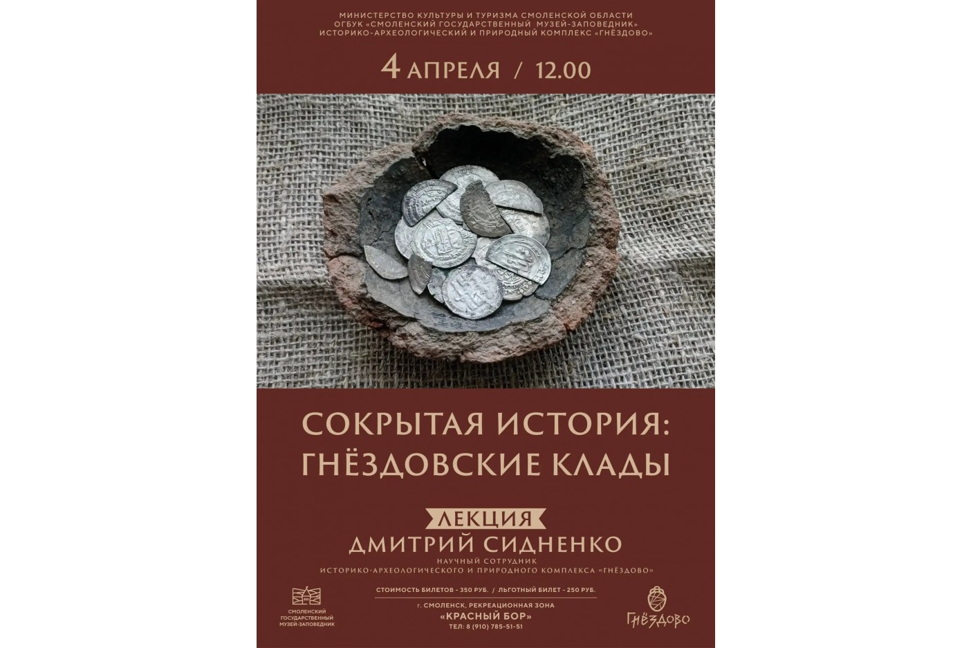 Лектор, научный сотрудник Дмитрий Сидненко, даст подробное описание состава некоторых наиболее интересных кладов, расскажет любопытные детали, связанные с их обнаружением, в том числе осветит удивительные события, произошедшие при находке гнёздовского клада 1993 года.