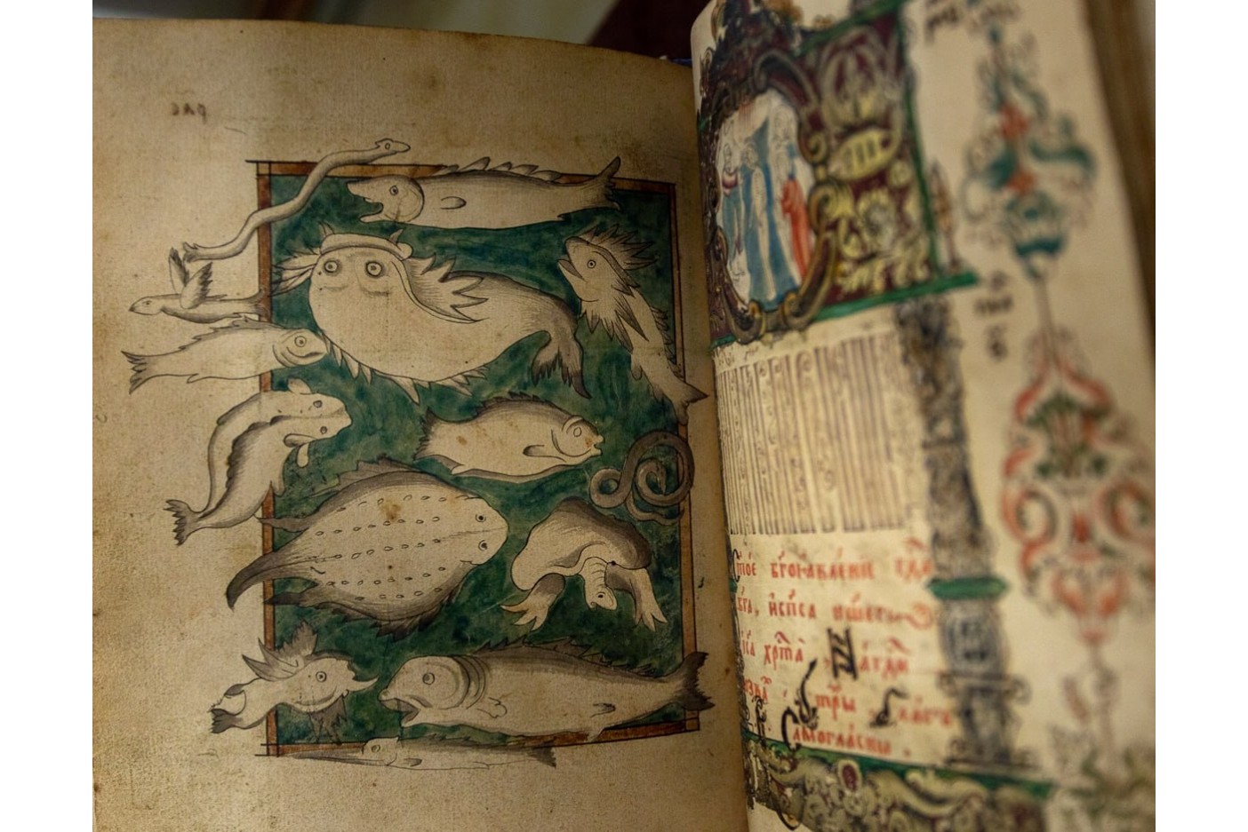 Невозможно представить православное богослужение без православной музыки, и на нашей выставке можно увидеть превосходно оформленную заставками и инициалами книгу «Праздники на крюковых нотах», которая написана знаками древнерусской безлинейной музыкальной нотации и включает песнопения великих праздников и святых.