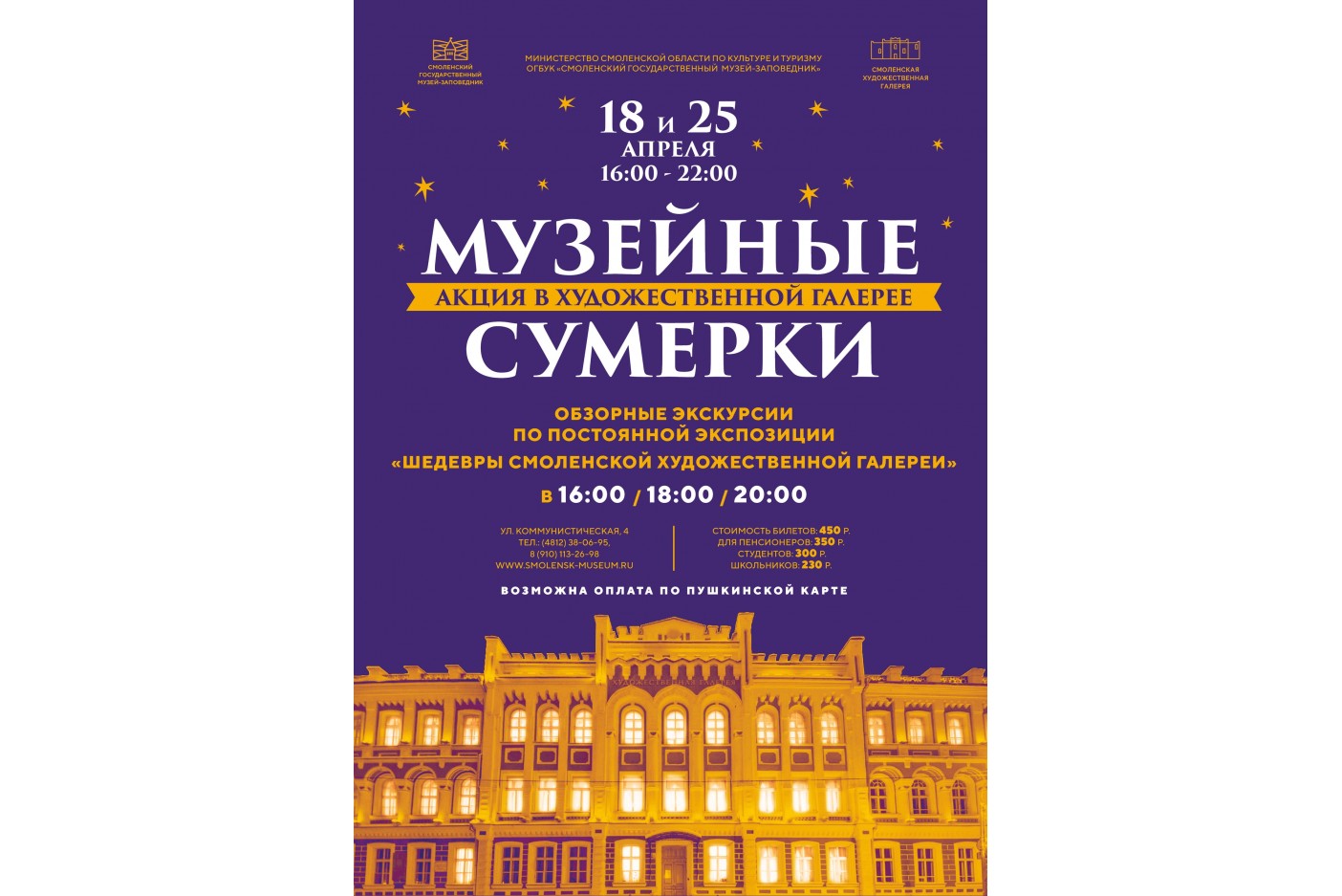 18 и 25 апреля приглашаем всех желающих посетить экскурсии по постоянной экспозиции, которые будут проводиться в 16:00, 18:00, 20:00.