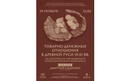 29 ноября в 12.00 состоится лекция научного сотрудника Дмитрия Сидненко «Товарно-денежные отношения в Древней Руси IX-XI вв. на материалах Гнездовского археологического комплекса». Посетители смогут узнать информацию о 15 кладах, обнаруженных в ходе археологических раскопок в Гнездове. Все они носят денежно-вещевой характер.