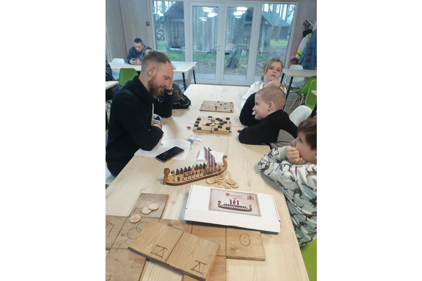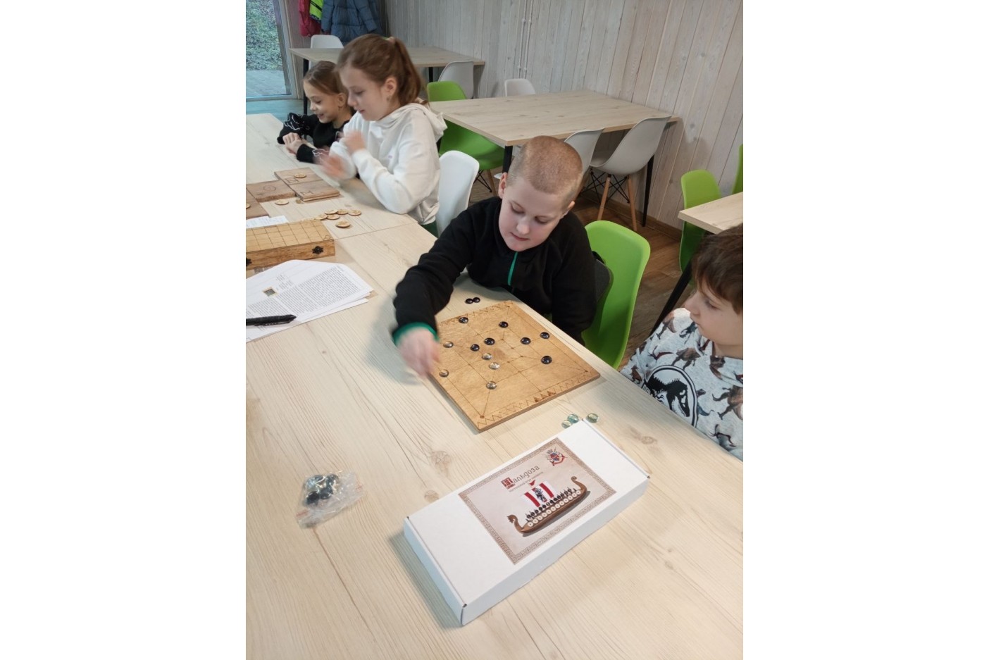 Ребята познакомились с известной у скандинавов игрой "Хнефатафл", которая похожа на упрощенные шахматы, увлекает своим сюжетом и необходимостью продумывать стратегию сражения.