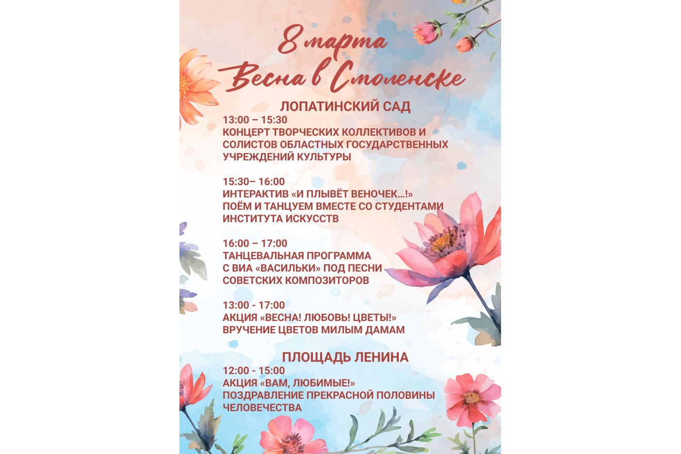 Делимся с вами программой праздника "Весна в Смоленске", который состоится 8 марта в Лопатинском саду и на площади Ленина!